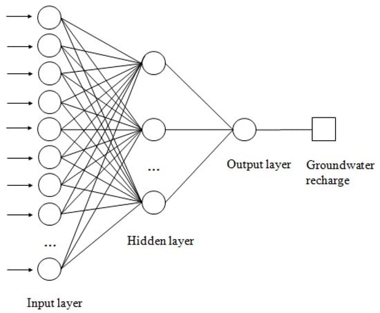At the beginning of the training, network weights and biases were assigned randomly. The solver for weight optimization is a stochastic gradient-based optimizer (Adam). The algorithm then projected these forward from the input layer to the hidden layer based on Equation (3). The results from the hidden layer were propagated to the output layer and the error between value of the output layer and the observed groundwater recharge in training data was obtained. By propagating the error iteratively back to the network, the connection weights and biases were automatically adjusted until the network error reaches a pre-determined value. The predicted values could then be calculated using the input values of 20 potential variables based on the trained network parameters.