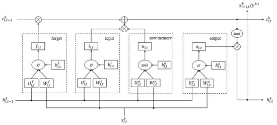 To solve the problem of vanishing gradient in traditional recurrent neural networks, Hochreiter and Schmidhuber [] proposed LSTM, which introduces a new structure called a memory cell to develop persistent long-term dependencies.