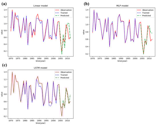 As shown in Figure 5a, there was relatively good fitness and several small mismatches between the trained data and observation for the linear regression model. However, the fitting performance between the predicted data and observation was poor, especially from 2010 to 2012, and the mismatch was serious. That is, the time series’ features obtained from the trained data could not successfully be applied to the predicted data when the linear regression model was used.
