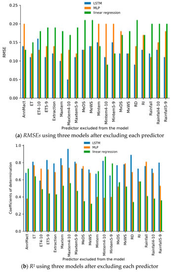 The relative importance of potential influential predictors for predicting groundwater recharge was investigated for each of the linear regression, MLP and LSTM models. The coefficients of determination and RMSEs are shown in Figure 6, where influential predictors were excluded one by one from linear regression, MLP and LSTM models. The variable importance ranking was found to be the same whether it was determined through RMSE (Figure 6a) or coefficients of determination (Figure 6b).