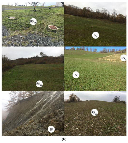 Soil samples were collected in seven sites located in the study area: six of those were taken from the area affected by the rotational slide and one from the earth flow (Table 1; Figure 1a,b). The sites were selected within the rotational slide to analyse differences (i) among the land use types (cultivated, overgrown, grassland) observed at the study area, and (ii) between the main scarp and the flat areas.