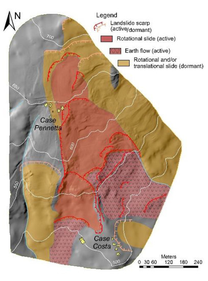 A major role is played by tectonics, which caused the development of faults and thrusts (representing weak zones with associated sets of fractures) controlling the recent uplift that conditioned most of the slopes’ geomorphological evolution [6,9]. Nevertheless, rainfall is the triggering factor, especially during those seasons (usually, autumn and spring) that are characterised by precipitations lasting for several days [10]. The distribution of precipitation is influenced by the recent climate changes [11], and prolonged dry periods alternated with intense rainfalls are more and more frequent. The relationship between initial slope conditions and rainfall frequency/intensity, and the reactivation of large landslides is a major research challenge [12,13], and some authors have attempted to find one-to-one correlation between rainfalls thresholds and slope failures [14], or to integrate methods [15].
