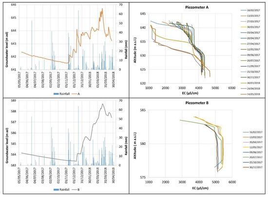 Hydraulic head measurements show several peaks during infiltration events (Figure 3), therefore suggesting rapid percolation of water from the ground surface towards the saturated zone. The groundwater EC varies significantly with depth, and the haloclines show variations over time, strictly related to local precipitations (see examples in Figure 3). Therefore, according to the results obtained in other sites [26,35], these EC variations depend on the effective infiltration of local rainwater that determines the mixing between lower-salinity fresh infiltration waters and higher-salinity pre-event groundwater. In both piezometers A and B, the EC in groundwater varies significantly with depth (Figure 3), with a great difference between the bottom (e.g., >4000 μS/cm in piezometer A) and the top value (e.g., around 1000 μS/cm in piezometer A). A step-like shape is observed in both wells. In each of the wells, the EC steps were always detected at the same depth.