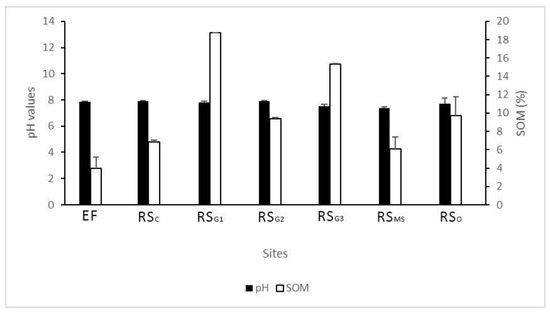Results of pH and SOM are shown in Figure 4. The different pH values, from neutral to moderately alkaline, were not significantly distinct from each other, while percentages of SOM depended on the sampling sites (p < 0.05). In the RSG1, SOM appeared to be higher than in the RSC, RSMS (p < 0.05) and EF areas (p < 0.01), in which it was significantly lower than in RSG2 and RSG3 (p ≤ 0.05; p < 0.01). According to the Pearson correlation, there was no relation between SOM and pH found in this study area.