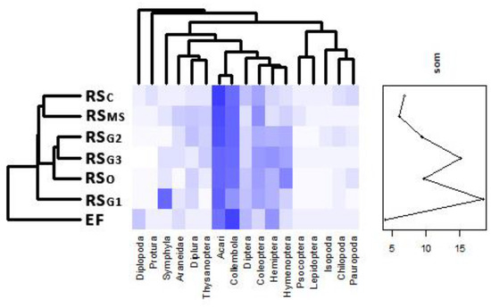 Table 2 shows the results of soil microarthropod community. Overall, 17 taxa were found in the study area, five of which found in all sites: Acari, Coleoptera, Collembola, Diptera and Hemiptera. The greatest total abundance per m2 was found in RSG2, statistically higher than RSC, RSMS, RSG3 (p ≤ 0.05) and EF (p < 0.01); EF showed the lowest abundance, less than in RSO and RSG1 (p < 0.05). RSC and EF areas revealed a significantly lower number of groups than the other sites (p ≤ 0.05), except for the comparison between RSC and RSG1, and between both RSC and EF, and RSMS. The best model to study soil fauna community data matrix was considering site and SOM as independent variables, with the result that each one contributed significantly to edaphic community composition (p < 0.01 and p ≤ 0.05 respectively). The Bray–Curtis distance denoted the greatest dissimilarity (from 38% to 50%) between EF and the other sites, particularly RSG2, while fauna composition appeared to be similar for over 80% between RSG2, RSG3 and RSO (Figure 5).
