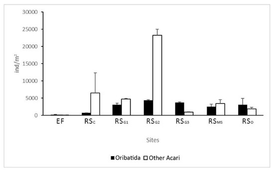 Greater Acari abundance was found in RSG2, significantly higher than in RSC (p < 0.05) and EF sites (p < 0.01); in EF their presence was lower than RSO and RSG1 (p < 0.05). Among them, a distinction was made between those belonging to Oribatida and to other Acari (Figure 6). The Acari community strongly depends on the site (p ≤ 0.01); with EF abundance of Oribatida significantly lower than that of the other sites (p < 0.05) except for RSC (lower than RSG2, p < 0.05) and RSMS. The abundance of Oribatida was greater than other Acari in RSG3 and RSO only.