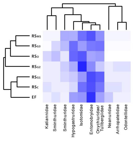 Like Acari, less abundant Coleoptera and Collembola were found in EF. The number of Coleoptera in EF was lower than in RSG3 and in RSO (p < 0.05). The abundance of Collembola observed in RSG2 was statistically greater than in RSG1 and in EF (p < 0.05, p < 0.01). Ten Collembola families were identified (Table 3), with four present in all sites: Entomobryidae, Hypogastruridae, Isotomidae and Onychiuridae/Tullbergiidae.