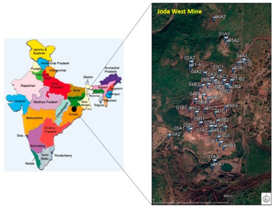 Joda West Iron and Manganese Mine (JWIMM) is located at about 20 km from Barbil town in Keonjhar, Odisha district, Eastern India (Figure 1). The iron ores belong to the Iron Ore Group (IOG) and manganese ore deposits. They are confined to shale formation of the Precambrian IOG. In particular, manganese ore bodies are associated with shales, laterite, chert, and quartzite of the IOG and are distributed within the horseshoe-shaped synclinorium, plunging towards NNE over folded towards SW. The shale formation occurs as a core of the synclinorium along Jamda-Koira valley overlying the banded iron formation (See geological details in Supplementary Material, Figure S1). From 1933 onward, the mining lease was granted in favor of Tata Steel. An enormous amount of solid waste is produced each year by mining activities. Valuable material possibly interesting for reuse or recovery, or rock waste not suitable for steel production, is all disposed of in stockpiles. Local workers accumulate wastes into stock deposits as big as mountains (see details in Figure S2), following the color/weight identification of rocks.