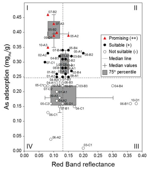 Bi-directional box plots of Red Band reflectance and As adsorption (mgAs/g) of sampled rock wastes, coded as in Figure 1. The overall median values of the two parameters (dashed lines) were used to discriminate samples with relatively lower and higher transmittance and adsorption potential (i.e., not suitable (-), suitable (+), and promising (++) for As removal). Samples were divided into four quadrants according to their characteristics. Quadrant I: high As adsorption and low Red Band reflectance (26% of samples); Quadrant II: High As adsorption and high Red Band reflectance (30% of samples): Quadrant III: low As adsorption and high Red Band reflectance (19% of samples) and Quadrant IV: low As adsorption and low Red Band reflectance (26% of samples).
