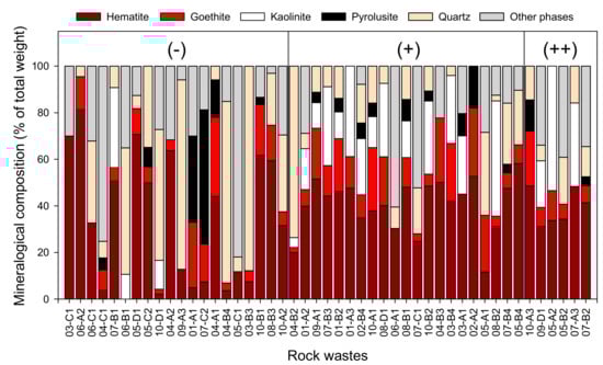 Mineralogical composition of sampled rock wastes (i.e., not suitable (-), suitable (+), and promising (++) for As removal), ordered by increasing As adsorption potential (from left to right). Mineralogical phases occurring in less than 30% of the samples were grouped and plotted as “other phases”.