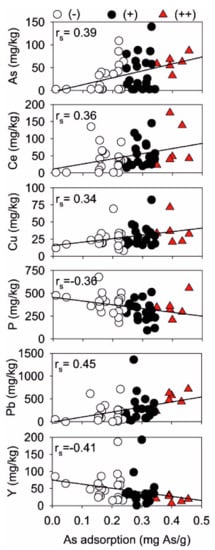Bivariate correlation plots evidenced that arsenic adsorption (mgAs/g) was significantly correlated with As, Ce, Cu, P, Pb, and Y naturally occurring in the sampled materials (mg/g, XRF measurements). The presence of Ce, Cu, and Pb led to an increase of As adsorption, while the presence of P and Y was inversely correlated. Despite data of As, Pb and Ce corresponding to their LOD value (2.8, 0.3, 1.5 mg/kg, respectively) being close to the x-axis (Figure 4), the As adsorption was measurable since the adsorption driving forces in rock waste were dependent on a combination of factors.