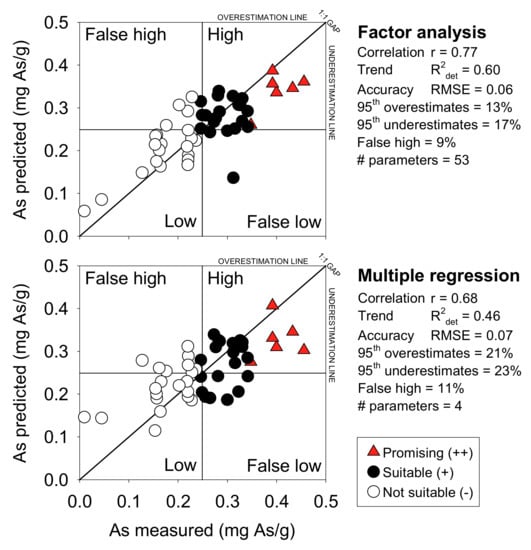 Multiparameter linear regression results based on (a) factor analysis performed on 53 parameters and (b) multiple linear stepwise forward regression, based on four selected parameters (As, La, Pb, and P). Goodness of fit are expressed through R2 and root mean square error (RMSE). Percentiles lines (95%) of prediction are plotted (dashed lines). Symbols indicate samples not suitable (-), suitable (+), and promising (++) for As removal.