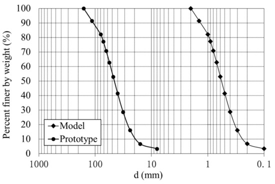 where g is gravity acceleration, h is approach flow depth, d is sediment size. Based on Equation (1), the sediment size scale is λd = λ2Uc = λ2U = 1:80. The model sediment was scaled down by λd = 1: 80 from the prototype sediment size distribution based on a field survey in the studied river reach (Figure 3). As there is an 18 m-high grade control structure with a stilling basin (for minimizing the downstream local scour) located about 2 km upstream of the 105th Provincial Highway Bridge, the upstream sediment is blocked by the grade control structure from entering the studied river reach. Therefore, the upstream sediment replenish rate was considered as zero and no sediment was fed during the test.