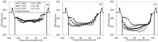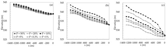 Transverse profile of different flood events (P = 1%–50%) at x = −800 m for z = 539 m (a), z = 533 m (b) and z = 527 m (c).