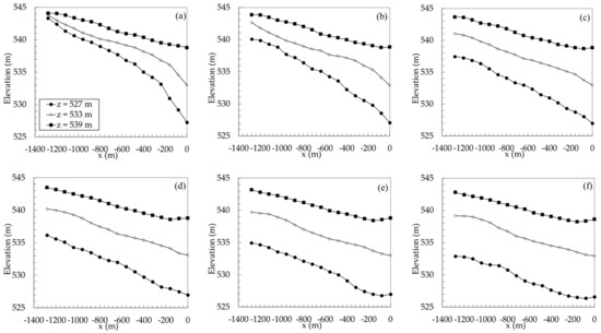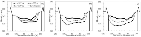 Upstream talweg profile after different flood events for z = 539 m (a), z = 533 m (b) and z = 527 m (c).