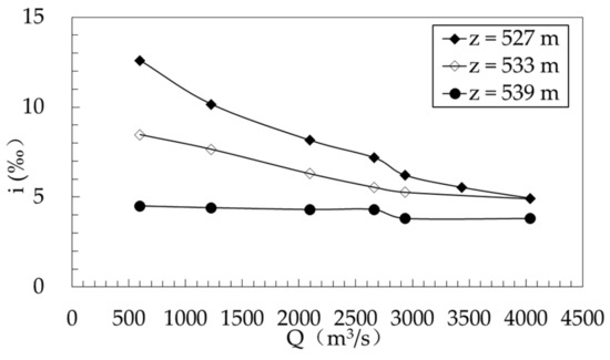 Figure 6 highlights the dependence of the average upstream bed gradient i on the flood discharge Q. Figure 6 shows that i is greater with a lower z. As the GCD drop enlarges the elevation difference between x = 1300 m and x = 0, the bed tends to develop to be steeper. Figure 6 also indicates that i is approximately independent of Q for z = 539 m, but decreases with Q for z = 533 m and z = 527 m. As shown in Figure 4 and Figure 5, the final bed elevation at x = 0 is fixed at the GCD. Thus, the increasing Q erodes more sediment from the upstream bed, resulting in a lower upstream bed level and a smaller average gradient.