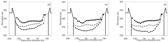 Figure 7 indicates that, for each z, the channel cross-section is deeper and wider with a higher Q. This is because the increase in Q increases the sediment transport capacity of the flow, resulting in greater erosion of the riverbed and riverbanks. Figure 7 also shows that, for a lower z, the difference in the cross-section depth and width caused by increasing Q is greater. More specifically, as shown in Figure 8, the channel cross-section of each discharge is wider and deeper for a lower z. The GCD drop can cause significant bed incision as shown in Figure 4 and Figure 5, inducing mass failures in the riverbank as the incised bed can not support the bank material. Our experimental observations also confirm that, for a lower GCD, more mass failure occurs in the bank.