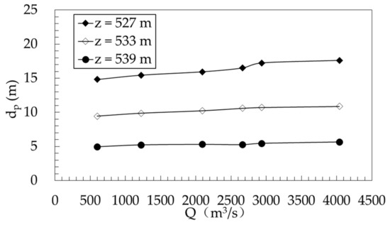 Figure 9 highlights the dependence of the maximum general scour depth dp at the 105th Provincial Highway Bridge on the discharge Q for different GCDs. In Figure 9, for z = 539 m, with the help of the GCS, dp is approximately independent of Q. For a lower z, even very small Q (P = 50%) can cause serious general scour at the bridge site (dp ≈ 9.4 m and 14.8 m). For z = 527 m, i.e., the GCS is completely removed, the dp can reach up to 17.6 m. For the new GCS design plan z = 533 m, the minimum dp is 9.4 m. Thus, this study suggests building a new GCS with z ≥ 539 m or a new bridge with much deeper foundations.