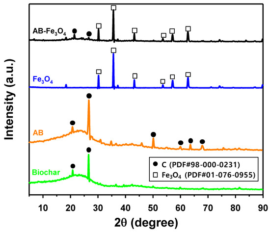 The crystalline structures of biochar, AB, Fe3O4, and AB-Fe3O4 were analyzed by PXRD, which are summarized in Figure 1. The PXRD pattern of Fe3O4 was comparable to another study [34], and both Fe3O4 and AB patterns were overlapped in a PXRD pattern of AB-Fe3O4 composite, indicating successful synthesis of AB-Fe3O4 composite.