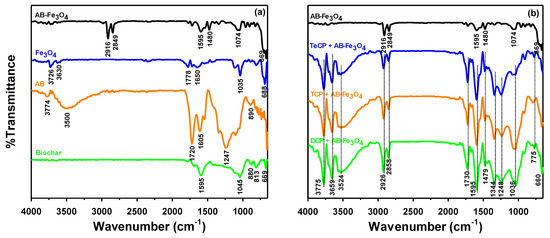 FTIR spectra of (a) biochar, AB, Fe3O4, and AB-Fe3O4 and (b) AB-Fe3O4 before and after TeCP, TCP, and DCP adsorption.