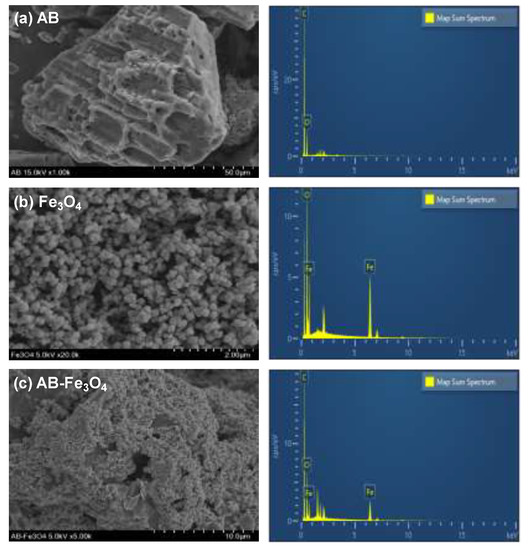 Figure 3a–c shows representative SEM images and EDX spectra of AB, Fe3O4, and AB-Fe3O4, respectively. SEM images revealed that both AB and Fe3O4 were spherical in shape, measuring 10–100 μm (Figure 3a,c) and ~20 nm (Figure 3b) in diameter, respectively. Using EDX (Figure 3a,b), we determined that the main elements of AB and Fe3O4 were C/O and O/Fe, respectively. The basis for our conclusion of the composite of AB-Fe3O4—as shown in Figure 3c—is as follows: (a) Fe3O4 nanoparticles uniformly covered AB surface through SEM image, and (b) elements of C (55 wt %), O (20 wt %), and Fe (25 wt %) were detected through EDX analysis.