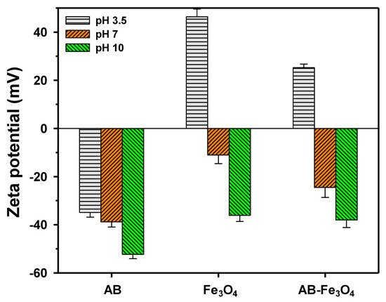 We measured the surface charge of AB, Fe3O4, and AB-Fe3O4 at pH 3.5, 7, and 10, as shown in Figure 4. The isoelectric points of AB and AB-Fe3O4 were lower and higher than pH 3.5, respectively, meaning that AB-Fe3O4 had a much higher positive surface charge than AB due to the positive surface charge of Fe3O4 at pH 3.5. Thus, we concluded that AB-Fe3O4 was able to achieve better adsorption capacity than AB if adsorbates were at a negative surface charge and a weak acid condition. Increased isoelectric point after composition with Fe3O4 was consistent with other studies, because the pH of zero point charge of Fe3O4 was close to pH 5~6 [39].