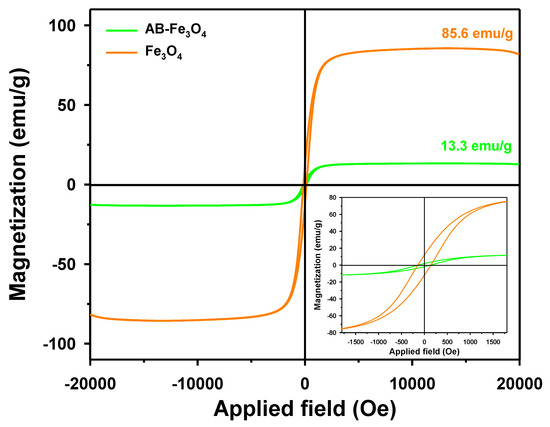 We analyzed the paramagnetic property of Fe3O4 and AB-Fe3O4 using magnetic hysteresis loops, as shown in Figure 5. The magnetization curves of Fe3O4 and AB-Fe3O4 showed that the specific saturation magnetizations of Fe3O4 and AB-Fe3O4 were 85.6 and 13.3 emu/g, respectively. The lower saturation value of AB-Fe3O4 compared to that of Fe3O4 could have been the result of lower Fe3O4 content in the AB-Fe3O4 composite [40]. The specific saturation magnetization of Fe3O4 was comparable to a previous report (e.g., approximately 80 emu/g [39]). Thus, the used AB-Fe3O4 adsorbent could be easily separated and recycled via external magnetic fields based on specific saturation magnetization of AB-Fe3O4.