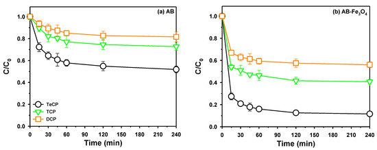 Subsequently, adsorption performances of AB-Fe3O4 were better than AB (Figure 6a,b), and these results could be explained by (a) stronger non-covalent π-electron acceptor–donor interactions attributed to higher oxygen content as an electron-donor group [12] and (b) larger surface area judging by the results from the porosimeter (Table 2). Considering TeCP’s high removal efficiency rate, we thoroughly investigate its use as an adsorbate in following sections.