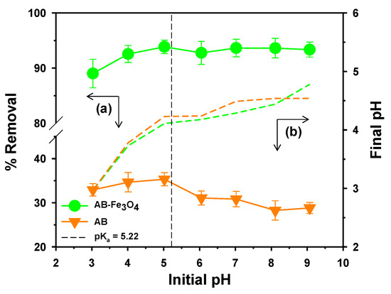 (a) Effect of solution pH on the uptake of TeCP by AB and AB-Fe3O4 (C0 = 5 mg/L, V = 30 mL, adsorbent mass 30 mg, agitation speed = 300 rpm, temperature = 25 ± 1 °C, and reaction time = 120 min); and (b) the final pH of the solution.