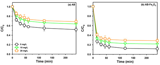 The effect of the initial TeCP concentration with a different contact time on TeCP adsorption was evaluated by AB and AB-Fe3O4, as shown in Figure 8a,b, respectively. As mentioned above, the removal rate of TeCP by AB-Fe3O4 was higher than AB, regardless of the initial concentration of TeCP, due to stronger non-covalent π-electron acceptor–donor interactions and larger surface area. Furthermore, the removal rate of TeCP continuously decreased with the increasing initial concentration of TeCP in both AB and AB-Fe3O4 cases, and these results could be explained by the fact that limited active sites were available when the mass of the adsorbent was fixed for binding adsorbates [43].