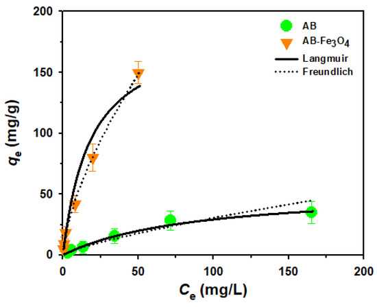 Equilibrium isotherms for adsorption of TeCP on AB and AB-Fe3O4 at pH 3.5 (V = 30 mL, adsorbent mass 30 mg, agitation speed = 300 rpm, temperature = 25 ± 1 °C, and reaction time = 240 min).