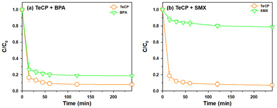 Effect of contact time on the uptake of TeCP with the presence of (a) BPA and (b) SMX on AB-Fe3O4 at pH 3.5 (C0 = 5 mg/L, V = 30 mL, adsorbent mass 30 mg, temperature = 25 ± 1 °C, and agitation speed = 300 rpm).