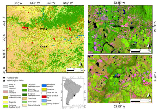 Land use and land cover from MODIS land cover type product (MCD12Q1) around the flux tower sites (left) and flooded rice crops highlighted in light green color located in Paraíso do Sul (PRS) (top right) and Cachoeira do Sul (CAS) (bottom right). The false-color (R6G5B4) compositions are from LANDSAT 8 OLI (Land Remote Sensing Satellite/Operational Land Imager) sensor for 28 January 2014.