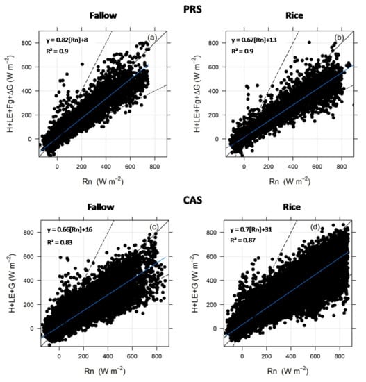 Scatterplots of the 30-min energy balance closure computed for fallow (non-flooded) (a,c) and irrigate seasons (b,d) at the PRS (top) and CAS (bottom) sites. The solid blue lines represent the linear fit of the data. The equations of the lines and R2 (coefficient of determination) value are also shown. For reference, the 1:1 line is a solid black line and the 1:0.5 and 1:2 lines are dashed.