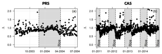 After the energy balance closing at daily timescale, we estimated daily Λ, that presented high values, with 0.92 and 0.98 at PRS and CAS sites, respectively, during irrigation season. It indicated that almost all energy was converted to LE, reflecting high water availability and rice canopies fully developed. During fallow season, Λ decreased to 0.87 and 0.86 at the PRS and CAS sites, respectively, with a higher standard-deviation (approximately 0.22, compared to 0.13 during the irrigation season). Kar and Kumar [] find Λ values ranging from 0.6 to 1.0 for irrigated rice crops, indicating that as rice crop emerges, and until reaching full development, the main energy partitioning driver is LAI, causing a decrease in soil evaporation and an increase in plant transpiration. Bouman et al. [] find an increase of Λ during crop-growing season and a decreasing trend during leaf senescence and crop maturation (before harvesting). The seasonal variation of daily Λ at PRS and CAS sites is shown in Figure 3, where it can be seen that higher values were concentrated in rice growing season. In fallow season, daily Λ values increased from harvest until new growing season. This fact can be attributed to the seasonality of climatic conditions.