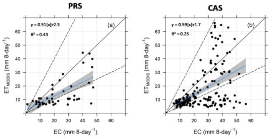 Scatterplots of the 8-day EC measurements against MOD16 ET estimates at PRS (a) and CAS (b). The solid blue lines represent the linear fit of the data and the grey areas represent the 95% confidence intervals. The line equations and R2 value are also shown. For reference, the 1:1 line is solid black line and the 1:0.5 and 1:2 lines are dashed.