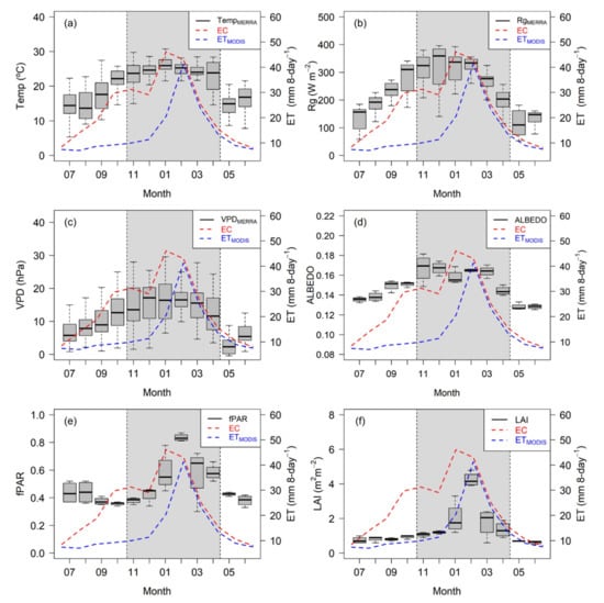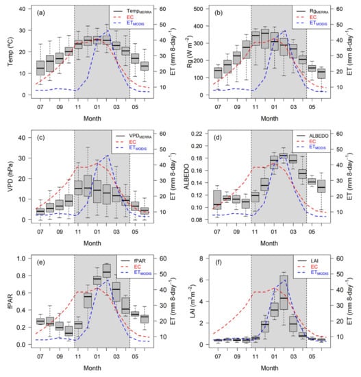 Seasonal pattern of EC measurements, MOD16 ET estimates and environmental variables (derived from MODIS remote sensing and MERRA reanalysis) from July 2003 to June 2004 at the PRS site. The grey boxes represent the inter-quartile range (IQR), the black tick lines represent the median and the whiskers indicate variability outside the upper and lower quartiles.