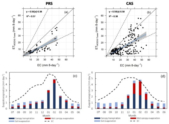 Scatterplots of the 8-day EC measurements against tower-driven MOD16 ET estimates at PRS (a) and CAS (b). The solid blue lines represent the linear fit of the data and the grey areas represent the 95% confidence intervals. The line equations and R2 value are also shown. For reference, the 1:1 line is a solid black line and the 1:0.5 and 1:2 lines are dashed. Evapotranspiration partitioning between canopy transpiration, wet canopy evaporation and soil evaporation over flooded cropland (rice cultivated in a flooding system) estimated using tower-driven MOD16 algorithm for 2004–2005 at PRS (c) and for 2011–2014 at CAS (d).