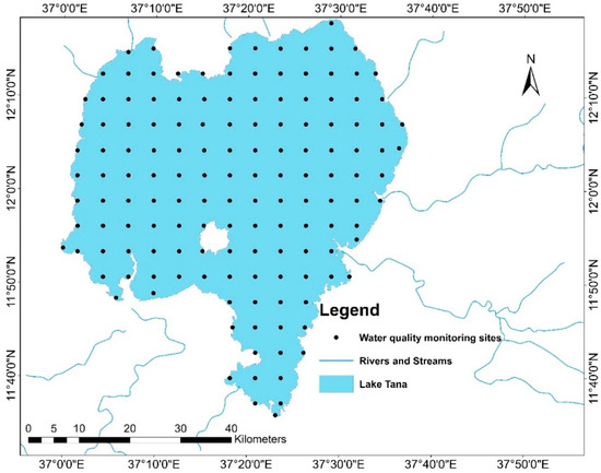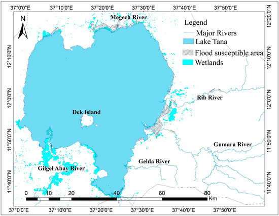 Lake Tana is located in Northwestern Ethiopia, with an average elevation of 1786 meters above mean sea level (m a.s.l.). Geographically, it is located in the range of 10°45′54.1″ N, 36°10′24.9″ E and 12°50′15.9″ N, 38°50′54.48″ E (Figure 1). The lake has a width of about 66 km from east to west and length of 92 km from north to south. The lake covers about 3156 km2, with a total drainage area of 15,000 km2 [36]. The lake receives 93% the inflow from four major rivers, namely Gilgel Abay, Gumara, Rib, and Megech [37]. In addition to gauged rivers (rivers which have hydrological stations to measure flow data), more than 40 ungauged tributaries (tributaries which do not have hydrological stations to measure flow data) flow into the lake. The major part of the Lake Tana basin is suitable for crop production. According to [20], 55% of the catchment area is used for cultivation, 21% consists of water, 10% is grassland and 1.6% is wetland. The cultivated land and surface runoff have shown an increasing trend between 1973 and 2010 [38]. The basin has an irrigation potential of 112,505 ha [39]. Urbanization of the Lake Tana basin is expanding, but there are no integrated waste management practices [40]. The load of non-point source pollutants is increasing in the Tana basin and in the highlands of the basin [23].