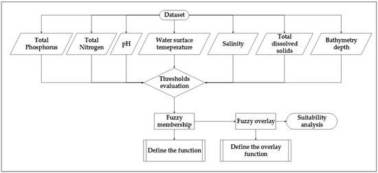 The suitability analysis was carried out using GIS-based multi-criteria decision analysis (MCDA) [51,52,53] with the fuzzy overlay function. Even though the fuzzy overlay is computationally complex, it gives more accurate and consistent results than weighted overlay [32]. Before applying the fuzzy overlay, suitable criteria for optimum water hyacinth growth for each water quality parameter were determined using the literature and the current infestation area survey of the lake. The map of the current water hyacinth covered area was used for validation.