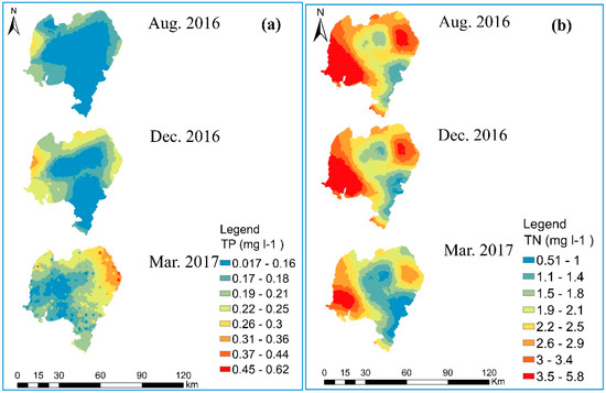 In Figure 4, the highest values of the total phosphorus (TP) concentration were observed in the dry season (December and March) and the lowest in the rainy season (August) (0.14 mg L−1 in August, 0.18 mg L−1 in December, and 0.21 mg L−1 in March). Phosphorus flowing from the catchment to the lake through runoff might be in particulate and dissolved forms. The particulate form can be re-dissolved and re-suspended by wind and waves [59]. Lakes with a low flushing rate have high retention [60]. Based on the results of [41], we have calculated the flushing rate of the lake and found it to be 18.4% per year of the net inflow, which is very low, and the residence time was estimated to be about 5.4 years. The retained particulate phosphorus can be re-suspended, and its re-suspension is higher in shallow lakes due to wind-induced remixing events [61,62,63]. The reason behind the maximum value of phosphorus in the dry season in Lake Tana might be the low flushing rate/high residence time, high retention capacity, and wind-induced re-suspension of the particulate phosphorus in the dry months when the temperature increases.