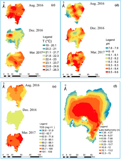 Spatial variability of total phosphorus (a), total nitrogen (b), temperature (c), pH (d), total dissolved solids (e), and lake bathymetry (f) over Lake Tana (August and December 2016 and March 2017, except depth data).