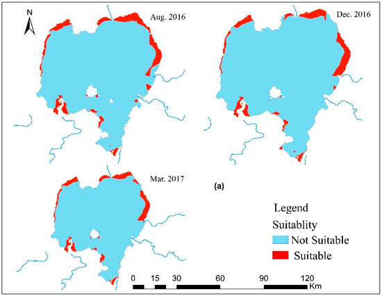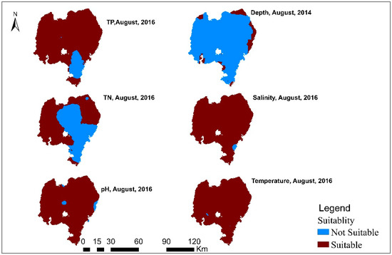 Six physical and water quality parameters such as depth, TP, TN, pH, TDS, and T were considered to establish layers of the MCDA. The threshold values established in this study were: depth < 6 m, total phosphorus > 0.08 mg L−1, total nitrogen > 1.10 mg L−1, a temperature range of 23–27 °C, pH of 8–8.60 and salinity < 0.011%. After the determination of the threshold values for each parameter, the spatial maps were prepared for each parameter using ArcGIS (ESRI, Redlands, CA, USA), Spatial Analyst tool, and Reclassify tool. Through fuzzy overlay analysis, the maximum invasion area of the lake was predicted (Figure 6).