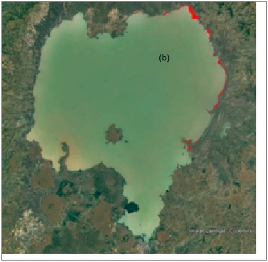 Although the southwest and northwest corridors of the lake are suitable for water hyacinth growth on the basis of the multi-criteria evaluation, the area is still free from the floating invasive weed, as shown in Figure 6b. Although further data collection and investigation is needed, the reason might be due to the wind and wind-induced wave direction. The floating weed moves into bays and quiescent parts of the Lake water surface due to the wind and wind-induced wave direction [69]. Based on personal observations during field work and direct communication with local people, it seems that the direction of the wind during the daytime is towards the northeast and the waves move in the same direction. At the same time, it is observed and verified that the growth of weeds is stable in the stagnant water bodies and in the littoral areas of the lake.