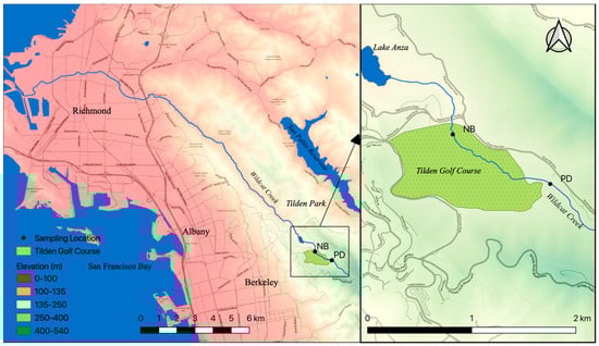 An increased occurrence of eutrophication and cyanobacteria in surface waters has led to the need for a greater understanding of potential sources of nutrient contributions to water resources [1]. Recent studies in the water bodies of the East Bay Regional Park District (EBRPD) [2] have focused on cyanobacteria blooms in Lake Temescal, Oakland, California; such blooms have also occurred in Lake Anza, Berkeley, California. The latter is part of the Wildcat Creek hydrologic system and downstream from the reach that is the subject of this research (Figure 1). The Wildcat Creek catchment has not been studied extensively, but is of great importance due to the diverse land use occurring within its perimeter. For instance, Tilden Golf Course (TGC), run by a private concessionaire, is an important recreational resource that is traversed by Wildcat Creek, a perennial stream that provides essential ecosystem services.