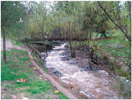 The Wildcat Creek upper watershed exhibits diverse land use (Figure 2) [18]. The catchment is exclusively within Tilden Regional Park; nevertheless, Figure 1 and Figure 2 show that the catchment is in close proximity to an urban area. In 2012, Landscape Architecture and Engineering, a consulting company contracted by the EBRPD, carried out a restoration project of Wildcat Creek within the golf course with the goal of enhancing habitat for fish and amphibians by way of a step and pool system [19]. The project consisted of building engineered in-stream steps to dissipate flow and create habitat for aquatic species, recontouring stream banks (Figure 3), and revegetation with native riparian plants [20]. Downstream of TGC, Wildcat Creek becomes channelized and concrete lined as it passes through the EBRPD botanical garden before reaching Lake Anza.