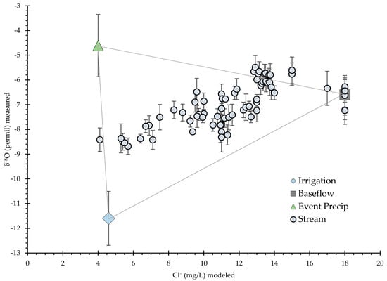 Graphical representation of end members and samples taken for hydrograph separation during an event from February 28th to March 6th, 2018. The geochemical tracers used for the 3 end-member mixing model were δ18O (vertical axis) and chloride (horizontal axis). The graph shows that the stream samples plot inside the mixing triangle, agreeing with the three end members identified. Error bars of end members represent standard deviation of the mean of measurements for the 3 end members. Error bars on stream samples are standard deviation (analytical uncertainty) from individual measurements. Horizontal error bars are within the symbol size.