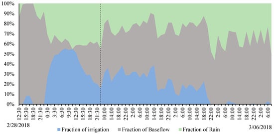 Figure 5 shows that as the rainfall intensity increases (see Figure 6 for the event hyetograph), there is an increase in the amount of irrigation water entering the stream. We hypothesize that irrigation water accumulates in the vadose zone during dry periods, and when there is a precipitation event, the irrigation water (pre-event water) is pushed out into the stream by the new event water that is infiltrating into the subsurface. The figure also illustrates that after the event nearly all of the irrigation water has been flushed out of the system and there is a two end-member mixture of “new” precipitation water and “old” baseflow/pre-event water. An analogous storm hydrograph, with similar component fractions, was observed for another runoff event, illustrating the importance of pre-event water, which includes a significant fraction of irrigation water, to stream flow generation in Wildcat Creek during runoff events (see Supplementary Figures S2–S4 for the storm hyetograph, graph of three end-member mixing and the hydrograph separation, respectively, for a precipitation event studied on April 5th to the 9th, 2018).
