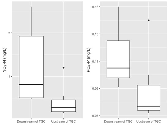 Boxplots of nutrients concentrations for samples collected upstream and downstream of TGC. The graph shows an increase in concentrations at the golf course respect to the upstream samples for both solutes analyzed, NO3-N (left) and PO4-P (right). p-values obtained from paired t-test were 0.048 and 0.018 for NO3-N and PO4-P, respectively, confirming the statistical significance of the observed increases.