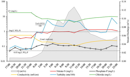 PO4-P concentrations in Figure 8 exceed the 0.05 mg/L limit throughout the event, with concentration values increasing as stream discharge increases; confirmed by the Spearman’s rank-order correlation between these two variables, yielding ρ = 0.45 and a p-value of 0.01. Similar observations were reported in the literature [29,30], and are explained by the fact that PO4 is associated with particulate matter. Figure 8 also illustrates the close association of PO4 with turbidity (ρ = 0.67 and a p-value < 0.001), showing a strong relationship between the two parameters.